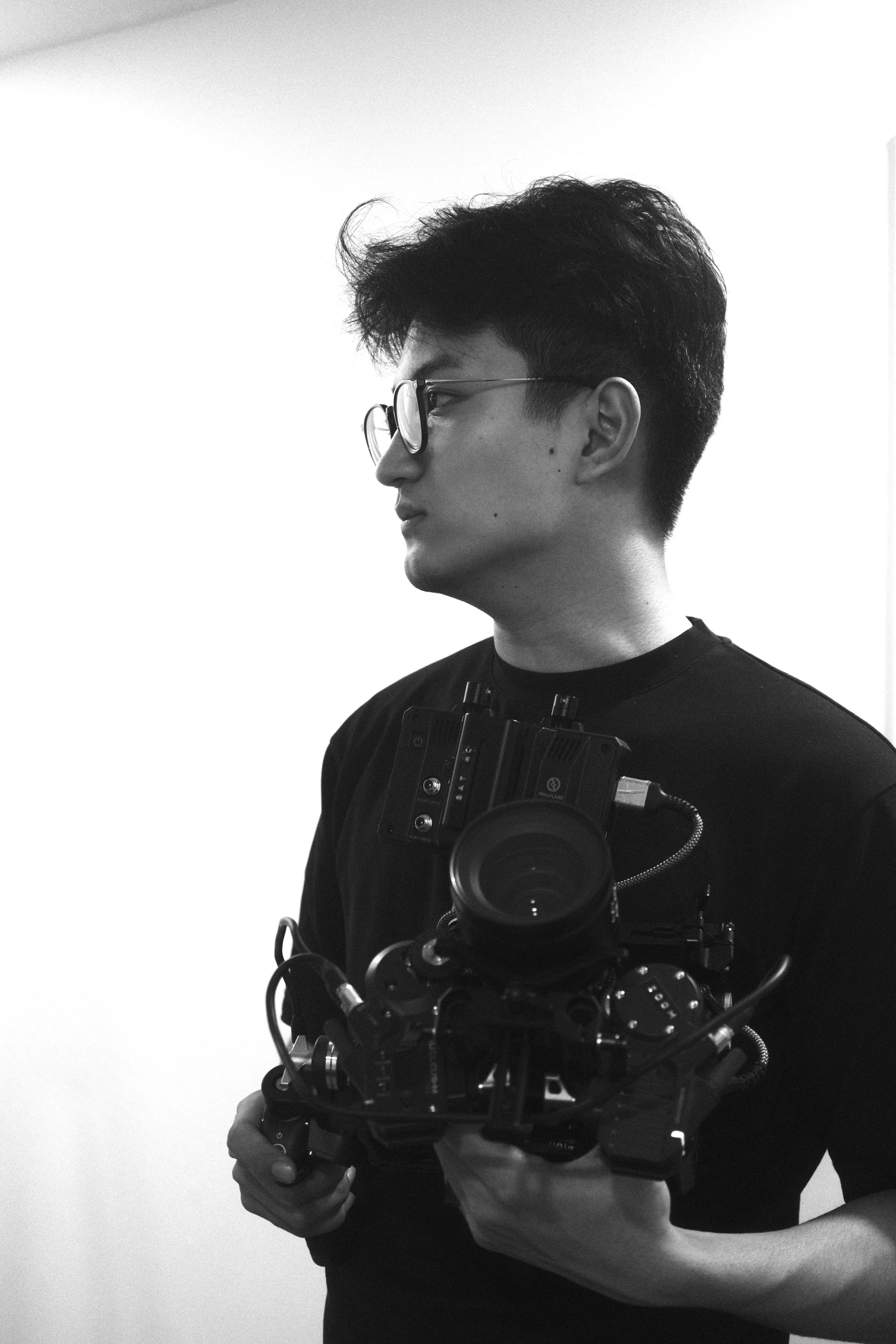A young man with dark hair and glasses holding a professional camera in a black-and-white photo.