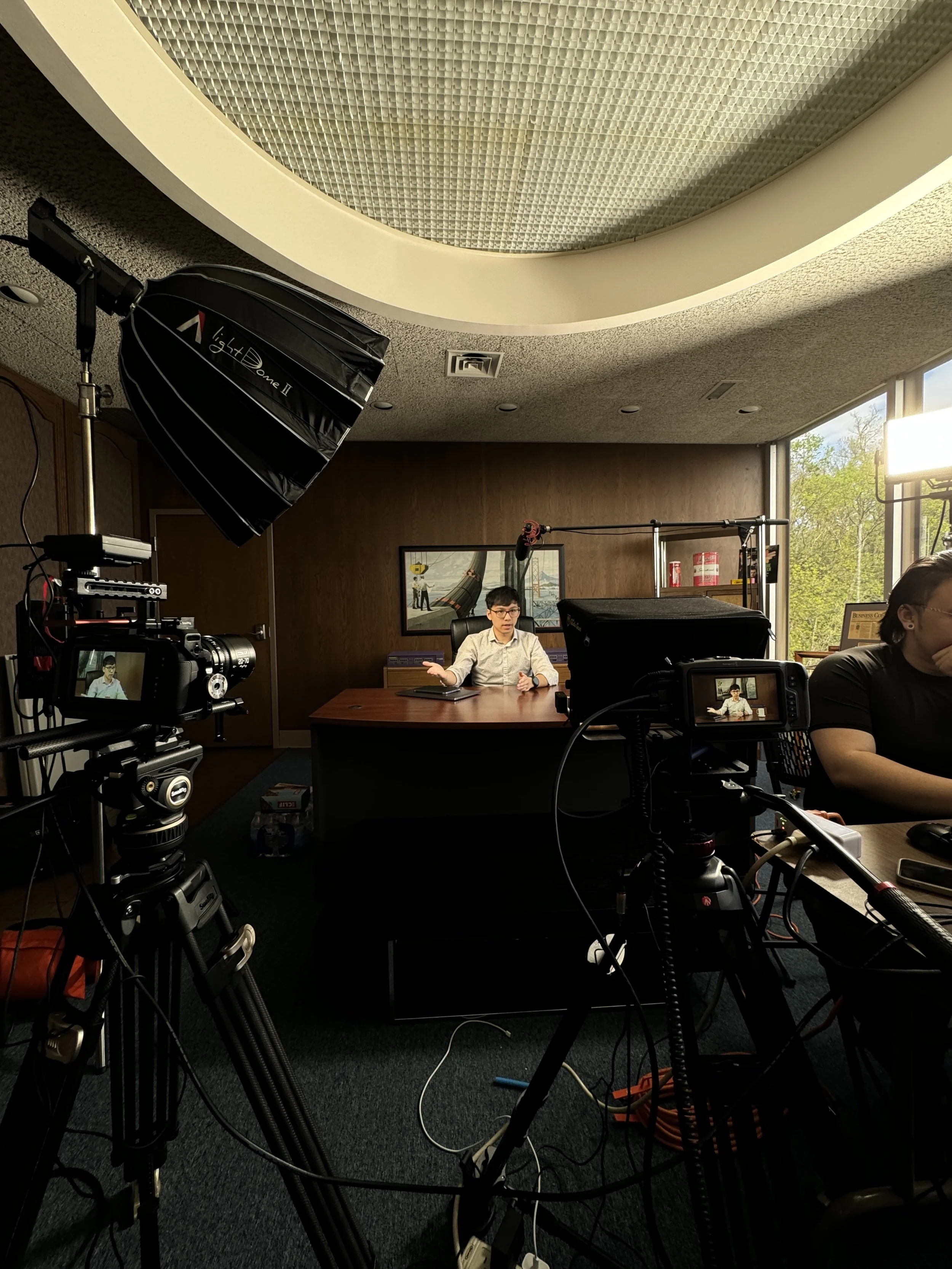 A man sitting at a desk during a video recording or interview in a professional studio setting with camera equipment and lighting.