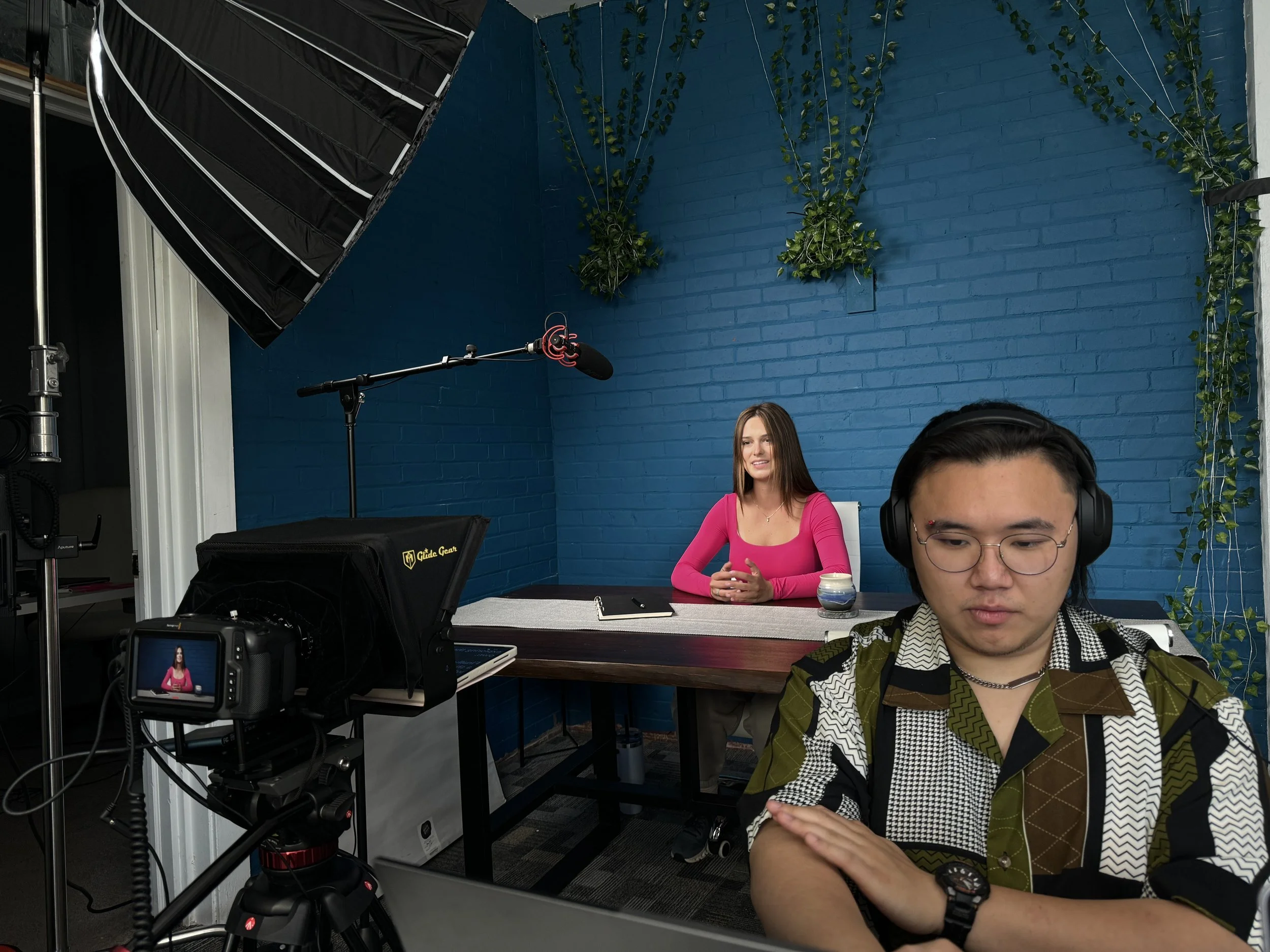 A woman in a pink top is seated at a desk in front of a blue brick wall with hanging plants, during a video recording or interview. A man wearing glasses, a patterned shirt, and headphones is in the foreground, working at a computer, with a camera and lighting equipment set up nearby.